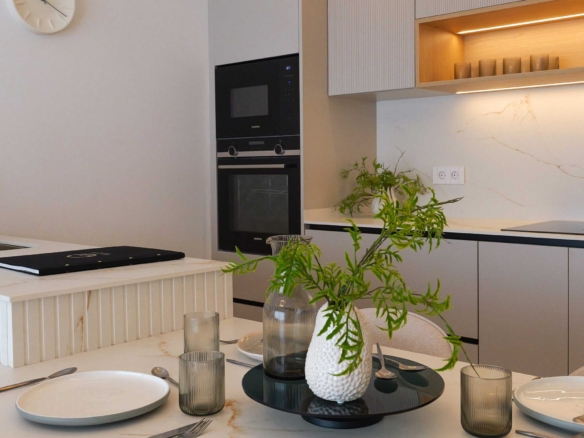Projekt obejmuje dwa nowoczesne, 9-piętrowe budynki, w których zaprojektowano eleganckie apartamenty z 1, 2 lub 3 sypialniami. Każdy apartament posiada przestronny, prywatny taras, z którego rozpościerają się spektakularne, panoramiczne widoki na morze — idealne miejsce na poranną kawę lub wieczorny relaks przy zachodzie słońca.