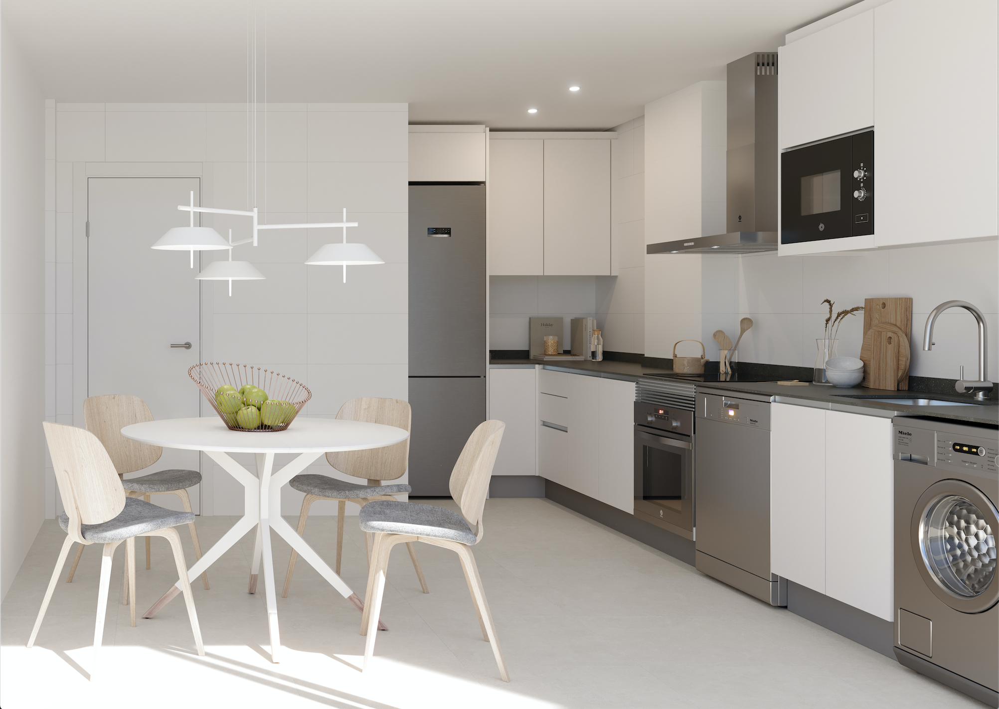 Kuchnia oferuje różnorodne wykończenia szafek (górnych i dolnych) z systemem otwierania na zintegrowane uchwyty. Do wyboru są różne style blatów. W standardzie znajduje się dekoracyjny okap ze stali nierdzewnej oraz zlewozmywak.