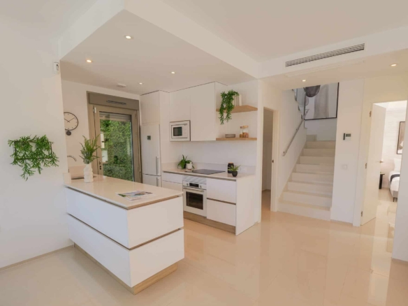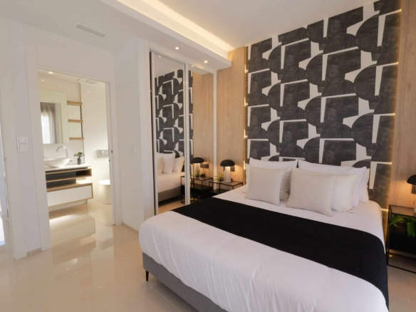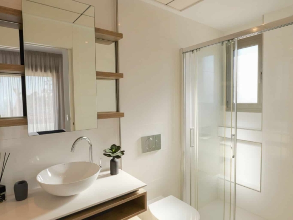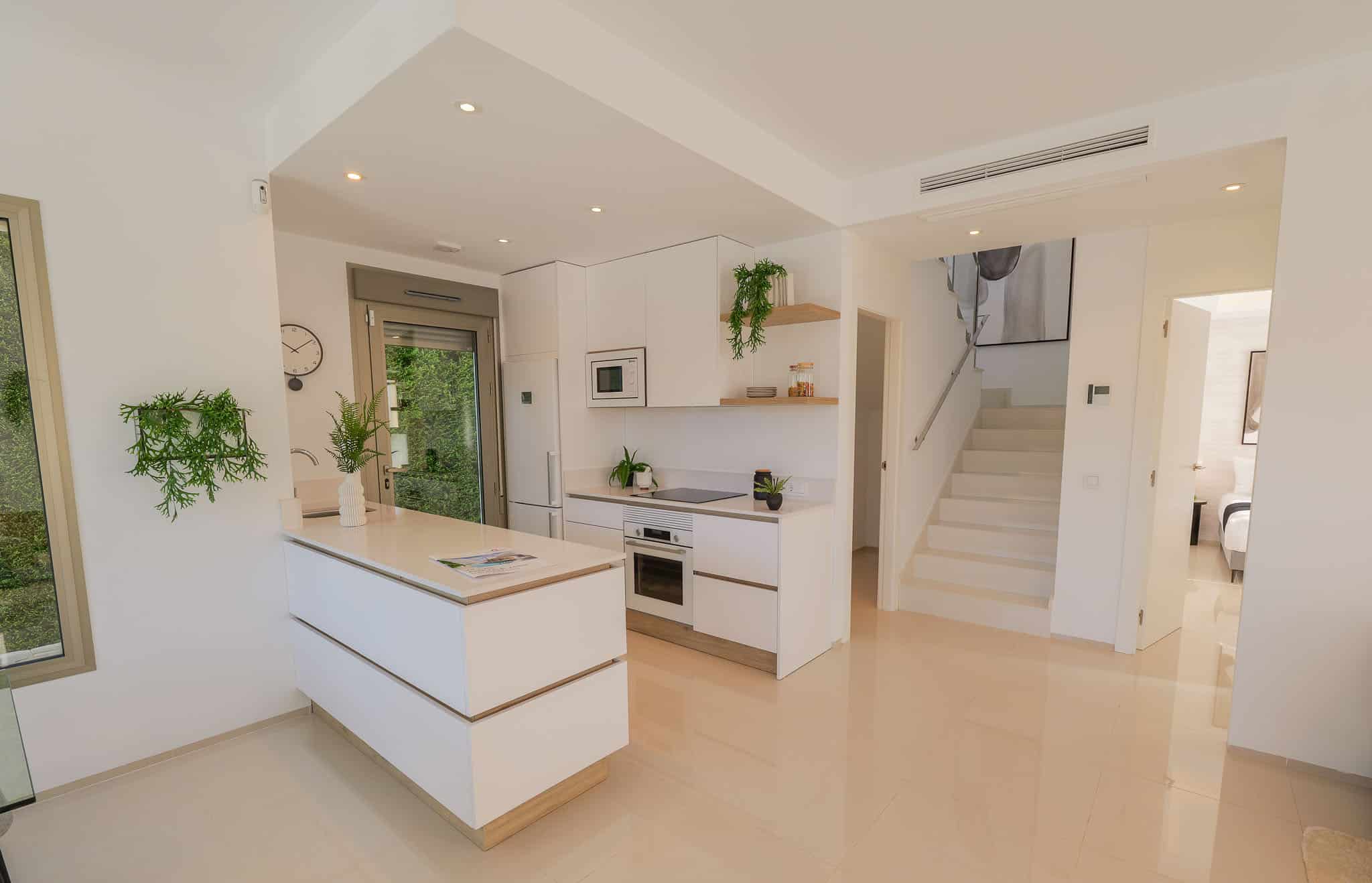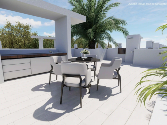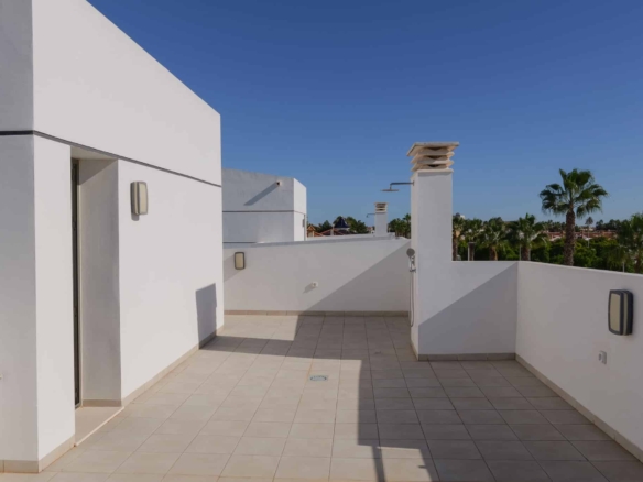 Każda willa oferuje trzy przestronne sypialnie oraz trzy nowoczesne łazienki, zaprojektowane z myślą o codziennej wygodzie. Dużym atutem są przestrzenie zewnętrzne: prywatny basen, miejsce parkingowe oraz przestronny taras na dachu (solarium), idealny do relaksu w śródziemnomorskim słońcu.