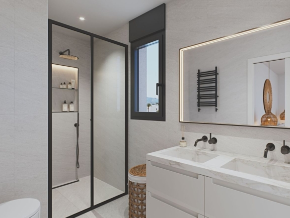 Wnętrza płynnie łączą się z przestrzenią zewnętrzną, gdzie znajduje się prywatny basen oraz duże tarasy idealne do wypoczynku przez cały rok. Na dachu zaplanowano wyjątkową oranżerię z letnią kuchnią – doskonałe miejsce do spotkań, relaksu i podziwiania śródziemnomorskiego krajobrazu.