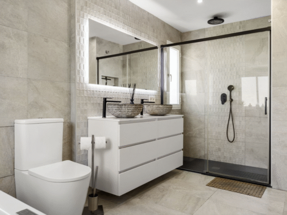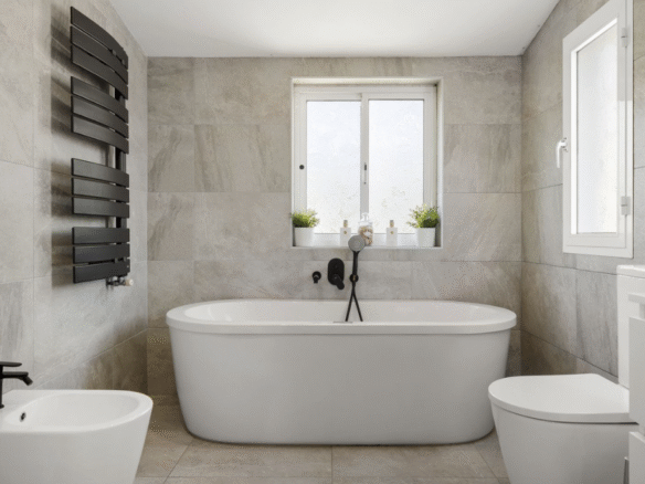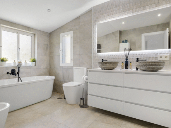 - Luksusowa łazienka z wanną z hydromasażem, kabiną prysznicową i ogrzewaniem podłogowym – w stylu domowego SPA